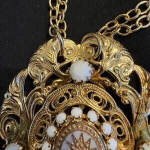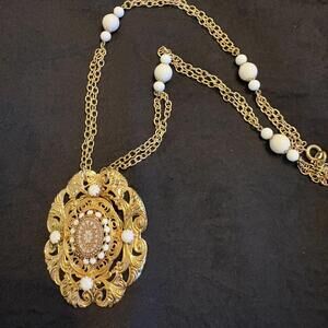 The Vintage Hobe Double Strands Gold Tone Bohemian Statement Beaded Chain Necklace features an oval-shaped pendant with a spring ring closure. The gold tone metal chain has a cable style with a length of 20 inches. The brand Hobé Laboratories is known for its quality craftsmanship and this original piece is signed by the maker, adding to its collectible value. Good vintage condition with signs of age but no missing glass beads. Just lovely!
