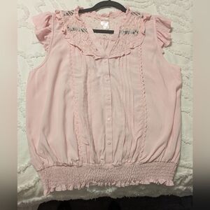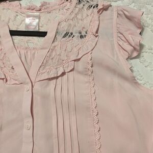 Charming light pink blouse with ruffle sleeves. Features lace detailing, smocked bottom and button front. Ideal for casual outings. Very light and feminine. PTP measures 23.