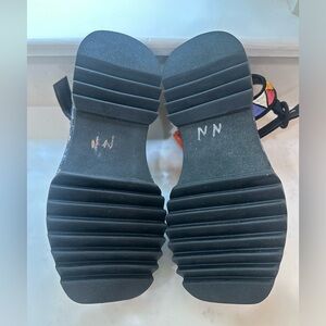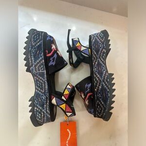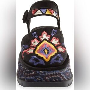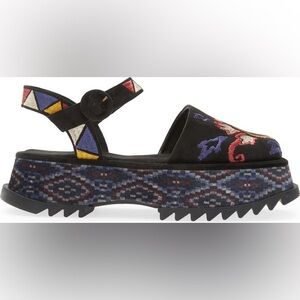 Vibrant embroidered design. Adjustable ankle strap. Chunky sole for comfort.