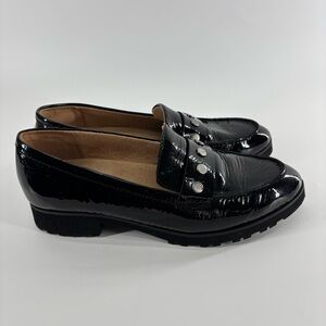 Naturalized women’s black patent leather loafers with silver studs. Size 8.5