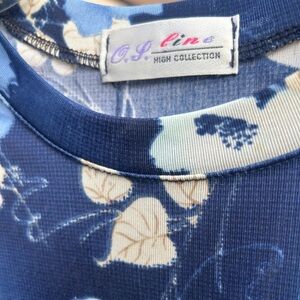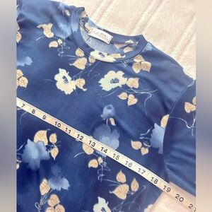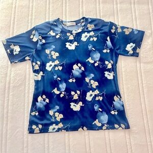 This sophisticated blouse showcases a charming floral design in blue and cream smooth stretchy material, offering a stylish yet relaxed look. The short sleeves and soft fabric make it a perfect choice for warm days, providing both comfort and elegance. Size medium, 19” pit to Pit, 22” length. Excellent condition, never worn.