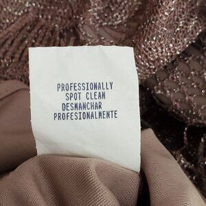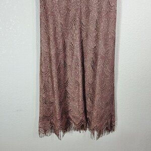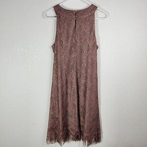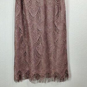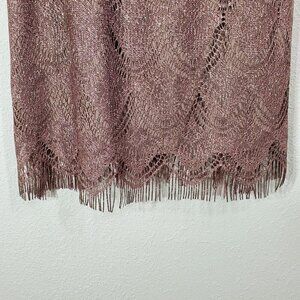 Crafted with a blend of acetate and metallic fibers, this dress features an elegant fringe hemline and shimmering rose gold finish, offering a sophisticated look.