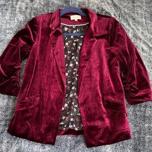 Luxurious velvet blazer in deep burgundy. Adds elegance to any outfit. Perfect for versatile styling. Only worn once.