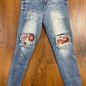 Trendy light blue skinny jeans with red floral patches. Distressed.