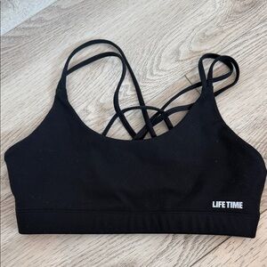 Sleek black sports bra with crisscross straps. Offers stylish support for active wear.
