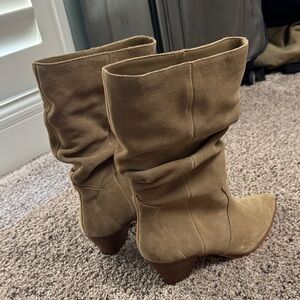 Elegant taupe suede boots with a stylish slouch design. Perfect for versatile wear.
