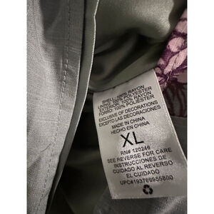Wallflower women's long-sleeve dress in size XL, featuring a sage green base with a purple floral print. The dress has a V-neckline with decorative trim, elasticated cuffs with ruffles, and eyelet lace detailing on the sleeves and hem. It includes a braided brown belt with a round buckle. The fabric content tag indicates a shell of 100% rayon and a lining of 100% polyester.