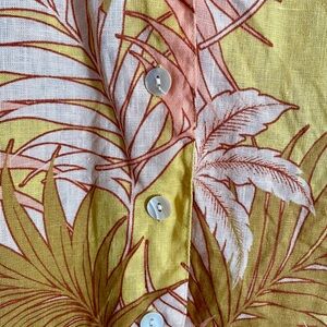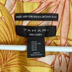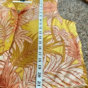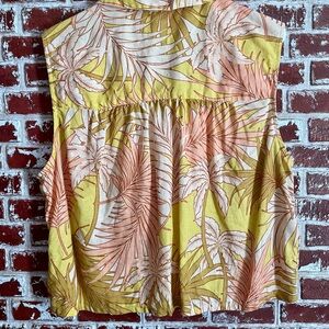 Tahari 100% linen botanical print sleeveless blouse with a vibrant tropical leaf design. Women’s size XL. Yellow tan peach pink colors. Button up with collar. Vacation resort summer beach tropical. Approximate measurements in pics. Little thread pulling shown in pics.