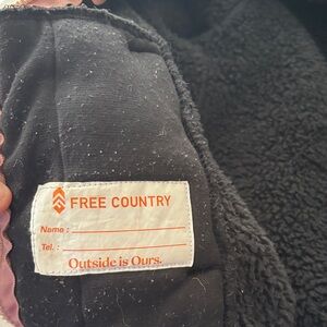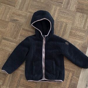 Cozy black jacket with Maeve/purple accents. Features a hood and front pockets. Perfect for keeping warm.