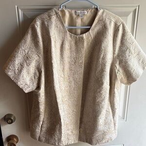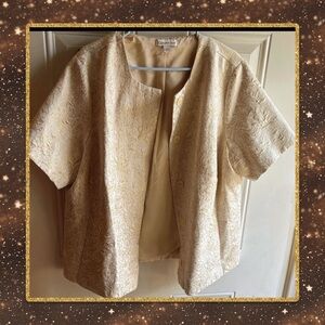 Elegant tan jacket with unique texture. Perfect for layering. Coldwater Creek shimmering jacquard short-sleeve blazer in an ivory color with metallic gold floral details. It is often described as formalwear or appropriate for special occasions due to the fabric and style. Retells for $30