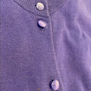 Classic cotton/nylon/spandex royal blue cardigan with button-up front and 3/4 sleeve. Think Aubrey Hepburn or Jackie O. Perfect for layering. Soft and stylish. Excellent condition.
