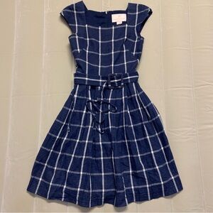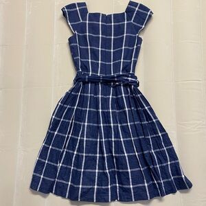 Windowpane check dress with a square neckline, a square buckle belt and squarely pressed pleats. Hidden back-zip closure. Square neck and back. Short sleeves. Back-tie belt with faux-buckle front. Lined. 100% cotton. Made in Vietnam.