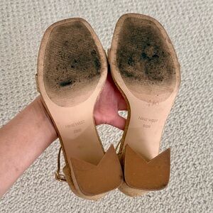 Nine West Ilea Sandals. Woven raffia. Great neutral color that works with many outfits. The shape of the block heel is really cool. Gold tone buckle. Gently used condition. Women’s size 5.5.