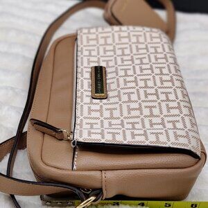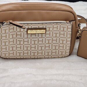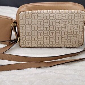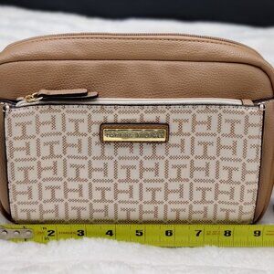 Tommy Hilfiger Monogram Crossbody Camera Bag with Matching Zip Wallet – Tan/Beige