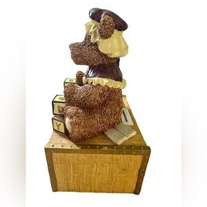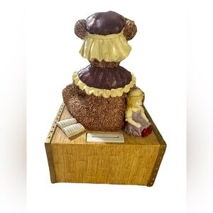 Ceramic “TEDDYLAND” bank with building blocks, a little ceramic doll on one side of the teddy bear and an open book on the other side of the teddy bear