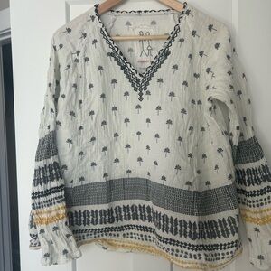 Johnny Was long-sleeve tunic made of 100% cotton gauze fabric with a palm frond pattern and black and yellow embroidery