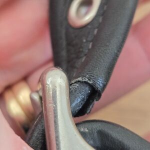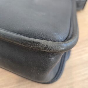 Excellent overall condition with minor corner wear, a seam under the buckle on one side and a couple of faint spots of discoloration. I have not tried to apply dye or colored polish to the spots or treat them in any way. I have applied a quality leather cleaner/conditioner and the leather is so soft and supple. No other flaws or excess wear noted. See photos for best description, material tag and measurements.