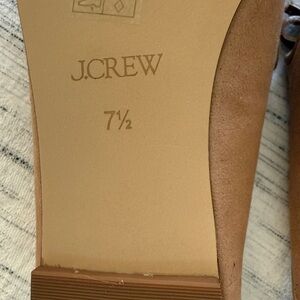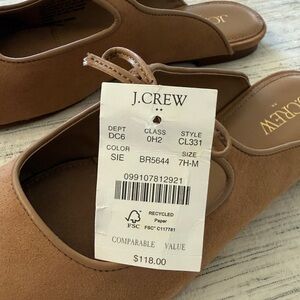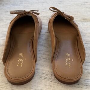 Elegant tan faux suede mules by J. Crew. Features a stylish bow detail. Perfect for versatile wear.
