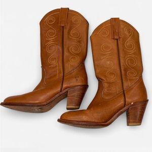 Vintage Frye Made in USA boots in tan leather. Features intricate stitching. Perfect for stylish outings.