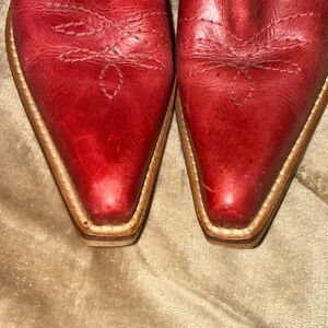 Bold red boots with intricate stitching. Perfect for a standout look.