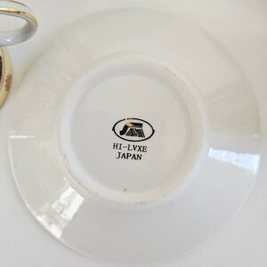 This is a lovely vintage porcelain espresso or demitasse cup and saucer set made by Hi-Luxe Japan. The set includes six cups and six matching saucers, featuring a hand-painted Victorian or Rococo-style scene with gold trim in a lusterware finish. There is gold gild on the handle of the cup as well. This is in lovely condition with no breaks, chips, cracks, or crazing. These come with the original box and packaging although there has been some damage to the box and packaging over the years with significant wear on the left side of the box. Fortunately, the damage to the packaging did not effect the contents which are in impeccable condition.