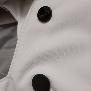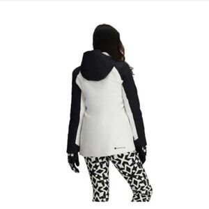 Obermeyer womens First Chair jacket, size 10, white/black, insulated, waterproof, breathable, fully seam sealed, YKK zipper, adjustable/removable hood, fleece lined collar/chin warmer, zipper chest/handwarmer/pass pocket, mesh gussets, adjustable cuff/hook and loop tab, interior windguard/carry system/goggle stash pocket, powderskirt * see pic for missing snap cap, new with tags, very good condition