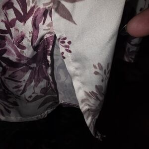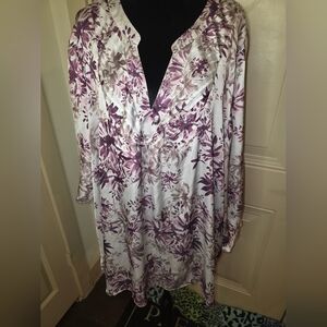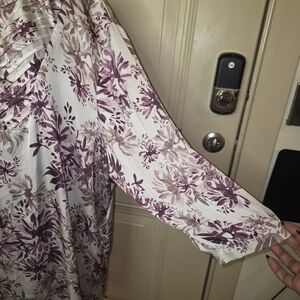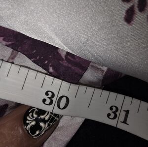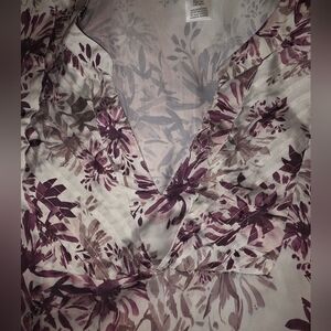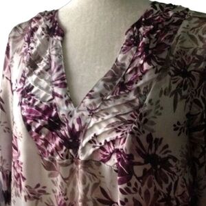 Runs big for oversized fit, pit to pit is 30. Purple Floral Roll-Tab with pockets and small side slits blouse. Pictures dont do it justice. Feels like lightweight satin.Flowy and flattering purple floral blouse with an easy, relaxed fit. Features a soft V-neckline with pleated detailing at the bust and roll-tab sleeves that can be worn long or cuffed for a casual vibe. Lightweight and airy fabric makes it perfect for warm weather, vacations, or beach days.