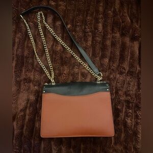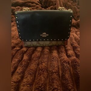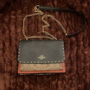 Chic Coach crossbody with black leather and gold chain. Stylish and versatile for any outfit. Can use as a shoulder bag or crossbody bag.