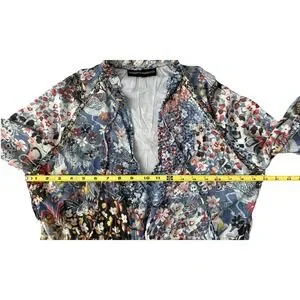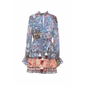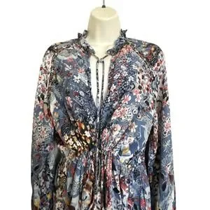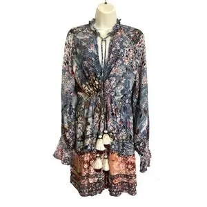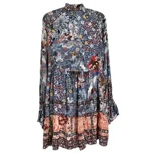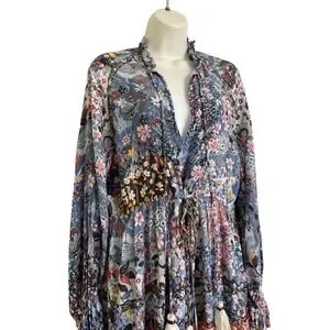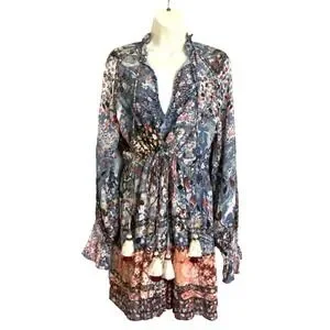 NEW Hemant & Nandita Blue Floral Mini Dress Boho Bohemian Peasant Long Sleeve M