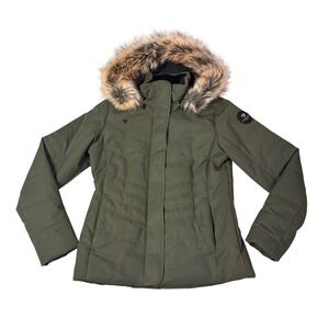 Obermeyer women's insulated ski jacket in olive green. Featuring a cozy faux fur trimmed hood and a design optimized for warmth and mobility, this jacket is perfect for hitting the slopes or navigating chilly city streets. Functional details include multiple interior pockets for secure storage and an adjustable hem for a customized fit. Ideal for winter sports, skiing, or everyday cold-weather wear.