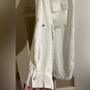 Elegant cream blouse with button-up front. Features chest pockets, raw hem & roll-up sleeves. Perfect for casual or formal wear.