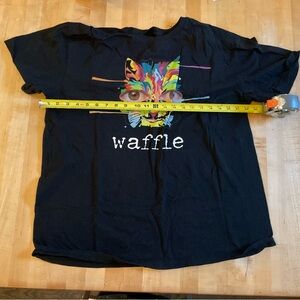 Black graphic T-shirt featuring the iconic Waffle Cat design — a wide-eyed, surreal cat graphic with colorful abstract details and the word “waffle” printed below. Cute, slightly uncanny, and perfectly on-trend for Alt-Y2K and Internetcore styling.