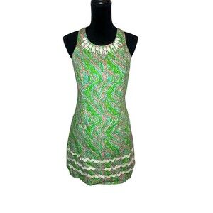 Lilly Pulitzer “Chomp Chomp” Pearl Shift Dress brings instant resort energy in a fitted, lined sheath silhouette. The green alligator print pops with pink and blue accents, while the scoop neck is finished with a statement beaded, embellished neckline and playful ric-rac trim at the hem. Easy pullover style and sleeveless cut keep it cool for spring and summer. Perfect for vacation, brunch, cocktail parties, or casual sunny days. Condition: Pre-owned.