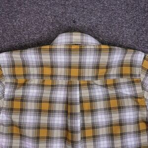 DIXXON Flannel Company Lager Beer Plaid Long Sleeve Button Up Shirt for Men in size XL. This stylish shirt features a classic plaid pattern in shades of yellow, white, and black, with two chest pockets and button closures. The inside collar and cuff lining reveal a contrasting blue color with a subtle graphic. Perfect for casual wear, outdoor activities, or a relaxed weekend outing.