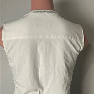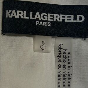 The product is a Karl Lagerfeld Paris women's sleeveless top in size SP. It features a round neckline, half zip front closure, and is made of chiffon fabric with added stretch for comfort. The top has a solid white color with wide straps and is designed for casual or business occasions. Made of a blend of nylon, spandex, and rayon, this top is perfect for all seasons and themes inspired by Paris.