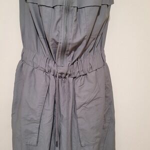 A utilitarian-inspired strapless jumpsuit offering both style and practicality. This garment features a full-zip front closure, a cinched drawstring waist for a customizable fit, and multiple cargo pockets on the legs for ample storage. The design incorporates a bandeau-style neckline and a relaxed silhouette, making it a versatile piece for casual wear.