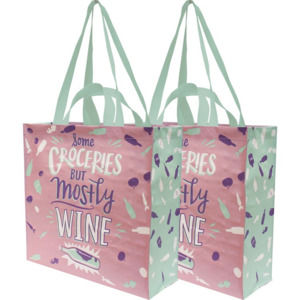 Woven from 95% post-consumer material, a double-sided market tote bag lending "Some Groceries But Mostly Wine" sentiment with veggie and wine bottle designs. Contains both hand and shoulder nylon straps.