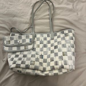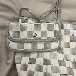 This is a MacKenzie-Childs Sterling Check Medium tote bag made of laminated cotton canvas with leather straps and a detachable pouch.
