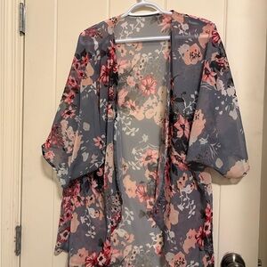 Sheer kimono with a lively floral pattern. Features pink, red, and cream flowers on a gray base.
