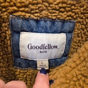 Stay warm and stylish with this classic denim trucker jacket. The jacket/coat features a cozy faux sherpa lining in a rich tan color, perfect for layering on chilly days. The mid-wash blue denim shell is made with a "Responsible Style" blend of at least 30% recycled cotton. It has a full button-down front, two chest pockets with button flaps, and two side welt pockets for your hands. The buttons are embossed. A timeless piece that is versatile for any casual outfit. This is a men's size Large.