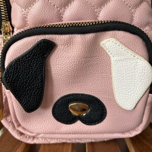 Adorable Betsey Johnson mini backpack in a soft pink heart-quilted faux leather with a playful dog face design on the front 🐶💗