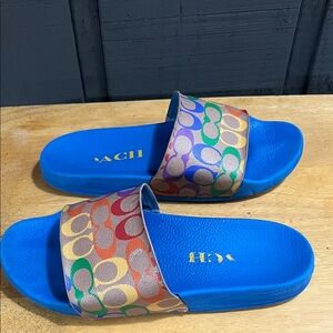 Bright blue slides with colorful Coach pattern strap. Fun and stylish for men or women. Men size 9 women size 10. Please look at each picture carefully for the condition. Ask any questions and make me an offer