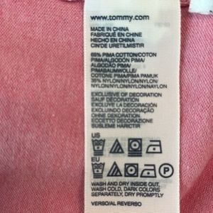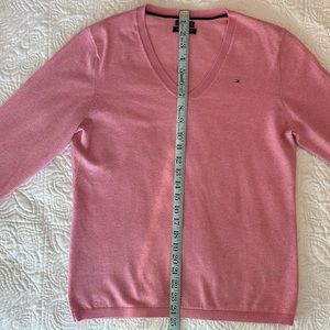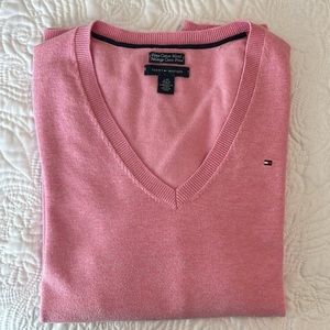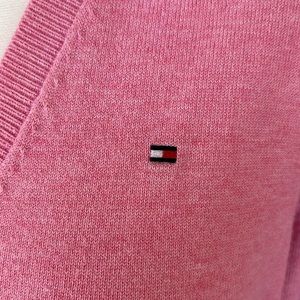 Stylish pink V-neck sweater. Features classic Tommy Hilfiger logo. Perfect for casual wear.