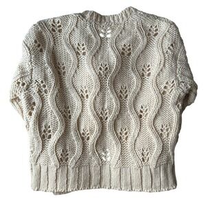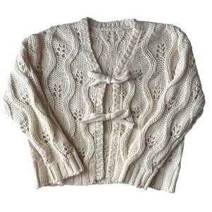 Cream chunky cable knit tie-front cardigan with a beautiful wave and eyelet knit throughout. Features a relaxed, slightly oversized fit with dropped shoulders, ribbed cuffs and hem, and two knit tie closures at the front.