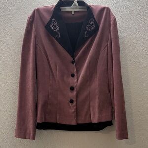 Chic mauve blazer with black embroidered collar. Button-up front. Perfect for versatile styling. Matching skirt included