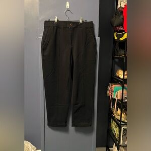 Black pill on straight leg pants. The front pleats, button (faux fly) and pockets give off a more structured look. Can be dressed up or down. Comfy and cute