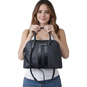 Michael Kors Cindy Dome Satchel Black Monogram Leather Trim Crossbody COA