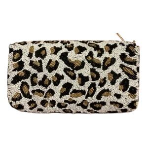 This stunning beaded clutch features a chic animal print design in black, white, and gold. Perfect for adding a touch of elegance to any outfit. My favorite one so far, love the gold chain too!!