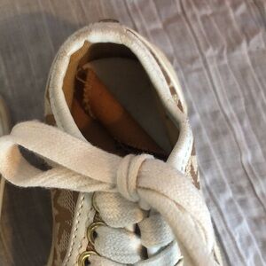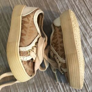 MICHAEL KORS girls toddler lace up sneakers size 6 in tan signature logo , gold Michael Kors accents on front & back .Thick rubber base.