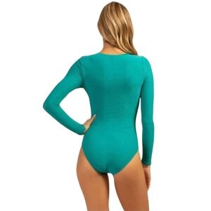 Stylish teal swimsuit with long sleeves. Features a unique gold accent connector at the neckline.